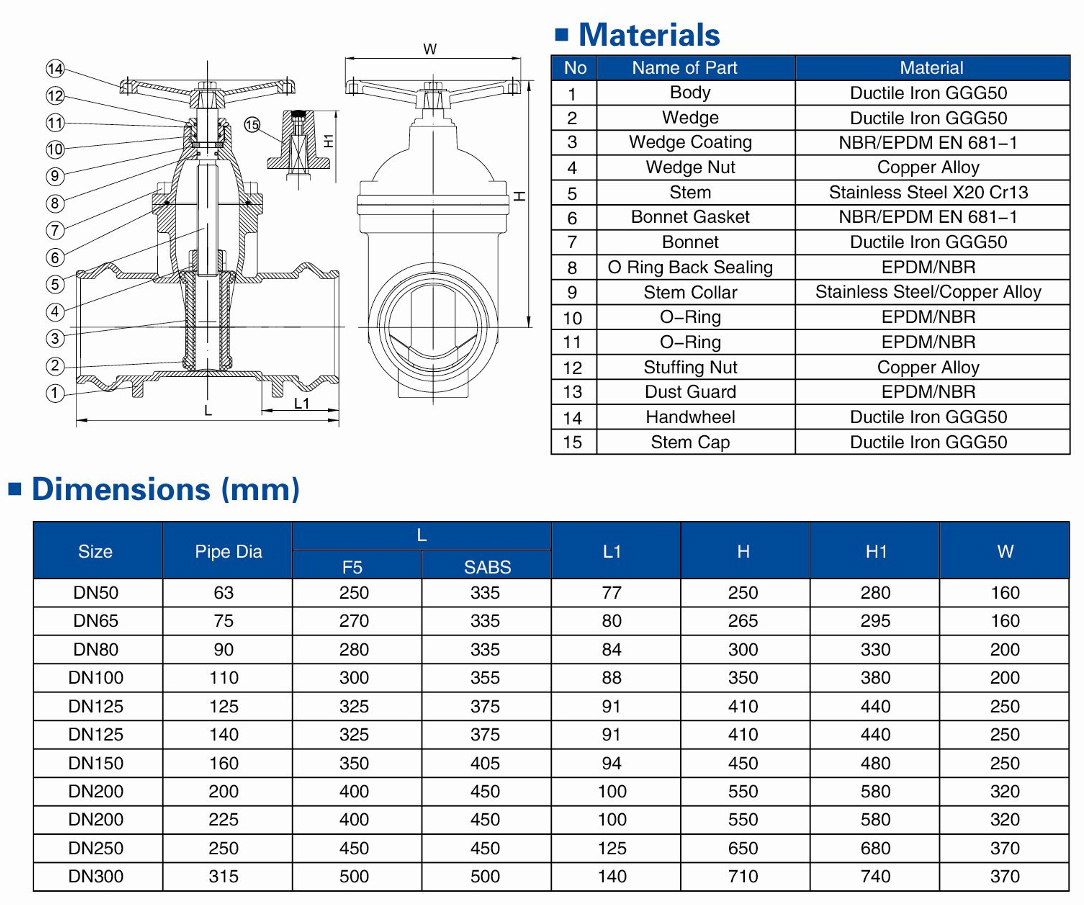 Technical Specifications1.Design Standard: EN1171(DIN 3352); SABS 6642. Face to Face Dimensions: DIN 3352 F5; SABS6643. Socket End Dimensions:1SO44224. Testing Standard: 1SO5208